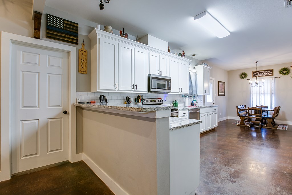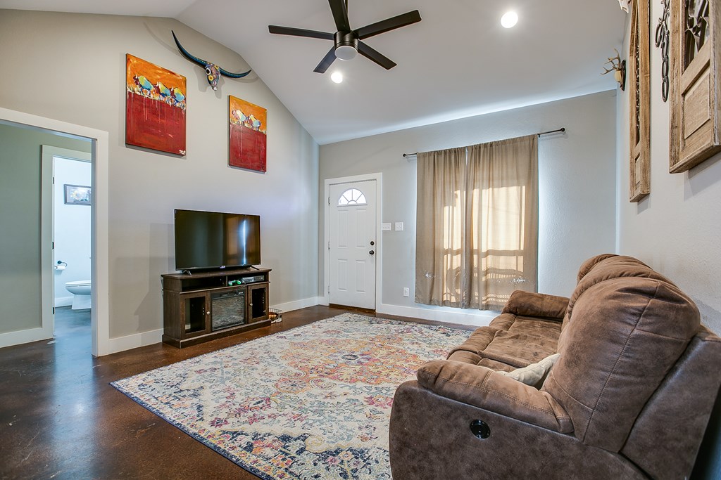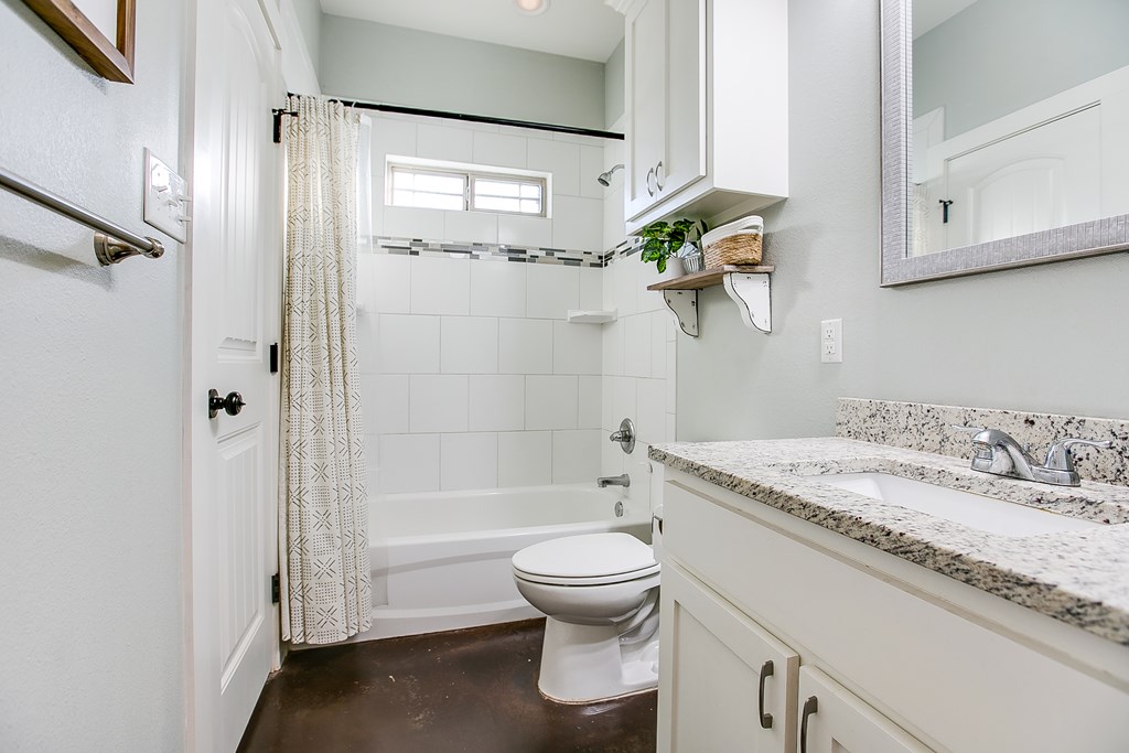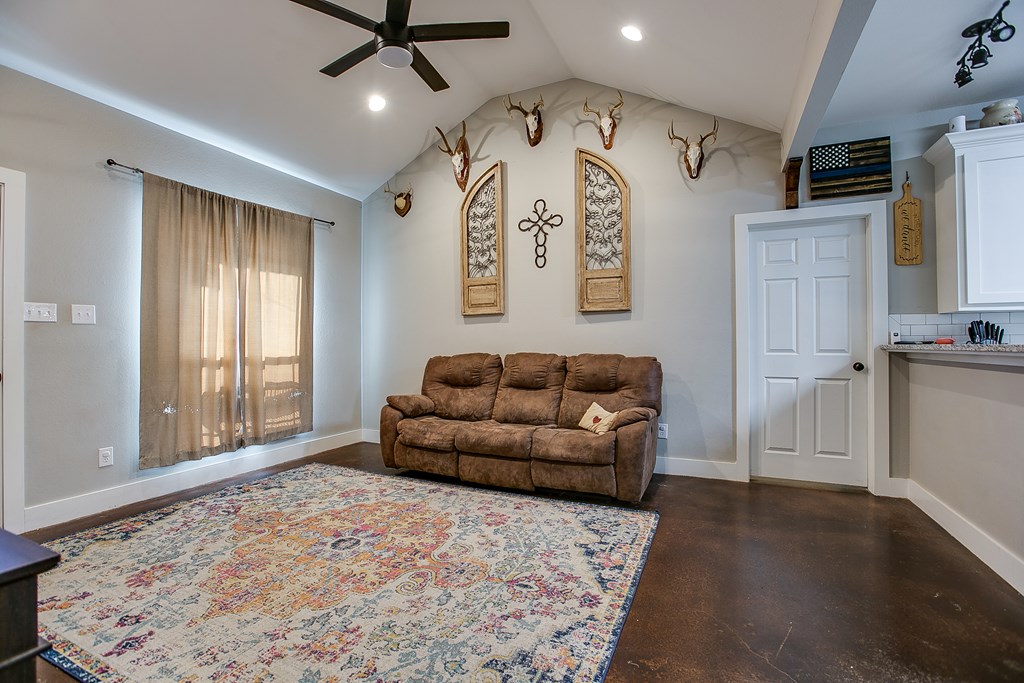 Located near Goodfellow AFB and just minutes from the Loop, this home impresses from the moment you step inside. Soaring ceilings and an open-concept layout make the living space feel even larger, with a kitchen designed to be both functional and inviting. This cozy yet spacious home offers 3 generously sized bedrooms, 2 full bathrooms, and a desirable split floor plan. Designed for low-maintenance living, features include stained concrete floors, double-pane windows, bright modern cabinetry, designer light fixtures, stainless steel appliances, and granite countertops throughout.  Step outside and enjoy a large, privacy-fenced backyard—perfect for hosting gatherings, setting up a fire pit, or watching the kids play. An additional storage building adds even more convenience. This home truly has it all: location, style, and comfort.