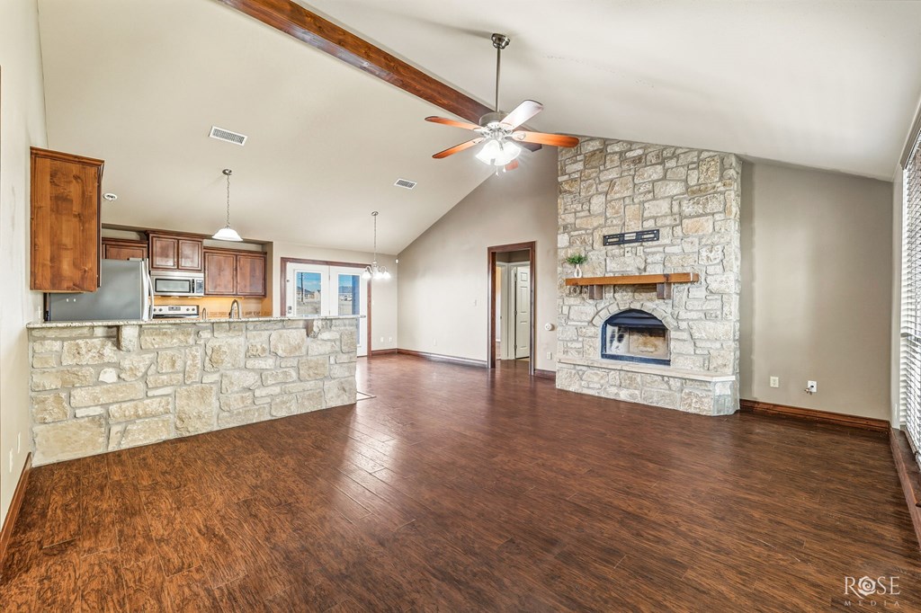 You will love coming home to this beautiful, well-kept 4-bedroom, 2-bath Texas country retreat located outside city limits in the desirable Buffalo Heights Community. Situated on a large corner lot, this property offers room to breathe w/ extra parking & space for an RV or boat. Mature trees & lush grass create inviting curb appeal & a peaceful setting. Inside, the open-concept living area welcomes you with tall wood-beamed ceilings, easy-care wood-grain flooring, and a stunning rock fireplace that anchors the space. The kitchen is designed for gathering and everyday living, featuring granite countertops, stainless steel appliances, ample cabinetry, and a cozy breakfast bar. The primary suite offers a relaxing escape w/ dual closets, a soaking tub, and a spacious walk-in shower. Enjoy a Texas-sized backyard w/ an extended patio & thoughtful cross-fencing, including privacy fencing near the home and gated wire-fenced sections—ideal for livestock, animals, or a true homestead lifestyle.